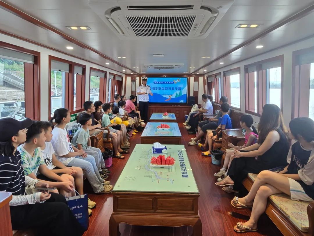 在防溺水小课堂上,学生们分组学习不同救生设备使用场景和方法,现场学习救生衣正确穿戴方法。还参与了趣味抢答和救生衣试穿展示等互动环节,表现优异的学生获赠水上安全知识读本和精美礼品。海事青年“零距离”为学生们上了一堂轻松愉悦、内容丰富的水上安全教育课,发放了《中小学生水上安全知识手册》和警示教育材料。防溺水小课堂结束后,海事青年带领学生和家长们乘坐“09588”船开展辖区巡航,亲身体验航行的乐趣。